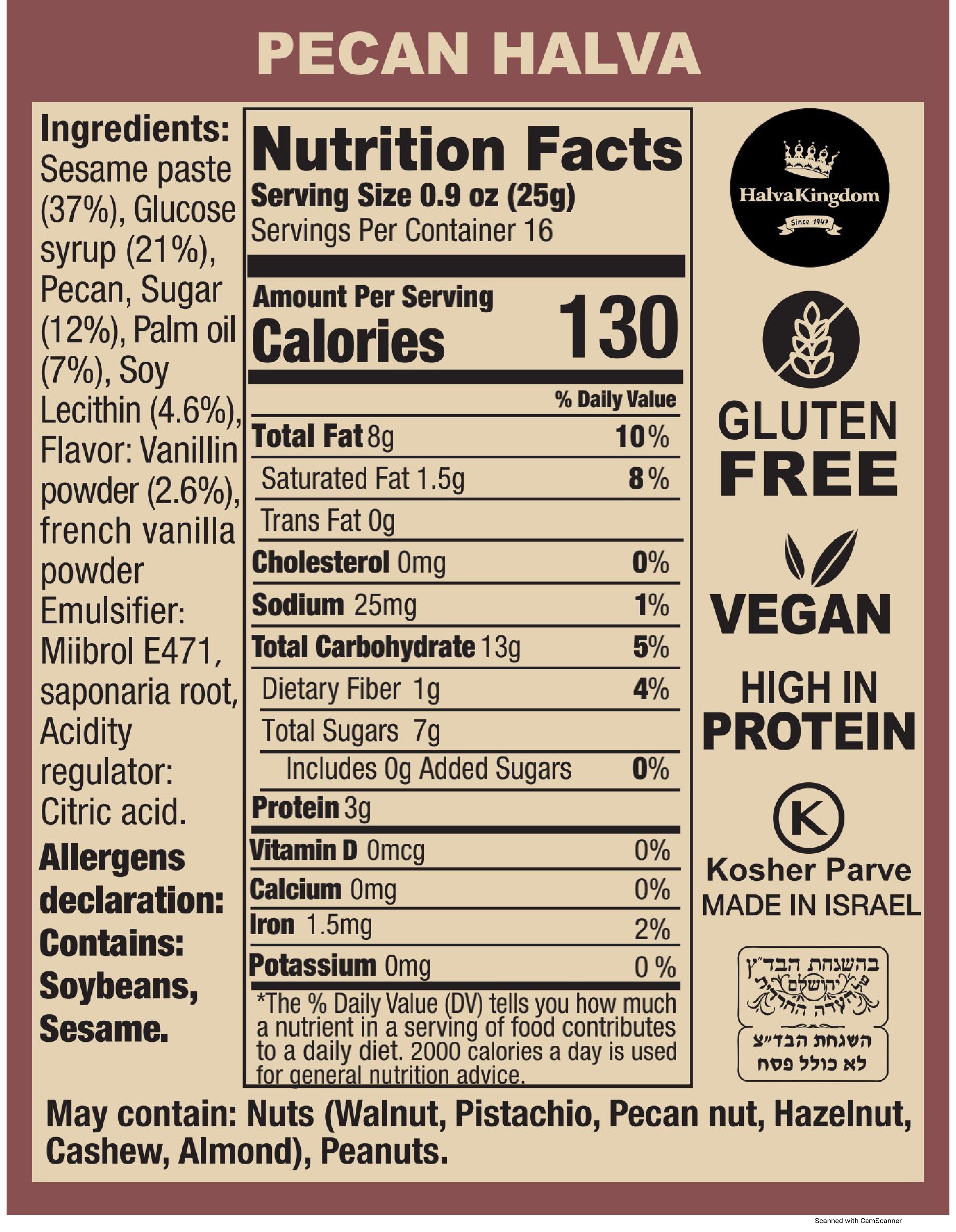Premium Pecan Halva Bucket Pecan Halva 100% NaturalHigh In FiberGluten FreePalm Oil FreePlant Based ProteinVegan FriendlyNet wt. 14 OZ/ 400 gramMade In IsraelBadatz Eida Charedi Kosher ParveNon GMODairy Free Keta &...