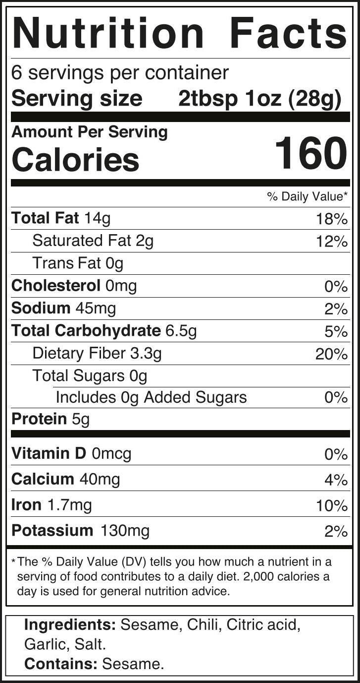 Premium Spicy Chili JarsSpicy Chili Tahini100% NaturalSugar FreeHigh In FiberGluten FreePalm Oil FreePlant Based ProteinVegan FriendlyNet wt. 6.3 OZ/ 180 gramMade In IsraelBadatz Eida Charedi...